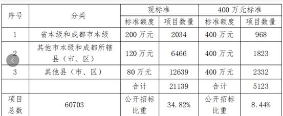 2.工程類(lèi)。將省本級和成都市本級限額標準由原來(lái)的60萬(wàn)元提高到100萬(wàn)元;除成都市之外的市本級和成都所轄縣(市、區)級限額標準由原來(lái)的40萬(wàn)元提高到100萬(wàn)元;其他縣(市、區)級限額標準由原來(lái)的20萬(wàn)元提高到100萬(wàn)元。