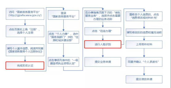 申請人在國家政務(wù)服務(wù)平臺注冊賬號并完成實(shí)名認證后,通過(guò)人臉識別進(jìn)入所選事項辦理頁(yè)面。若需修改個(gè)人信息的,通過(guò)“個(gè)人信息修改或補充材料”頁(yè)面,提出申請。(具體申報流程見(jiàn)下圖)
