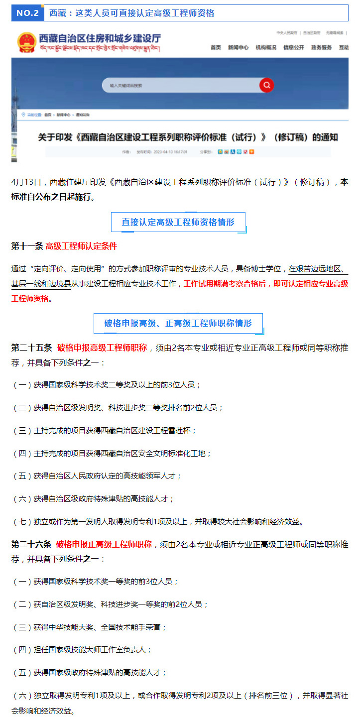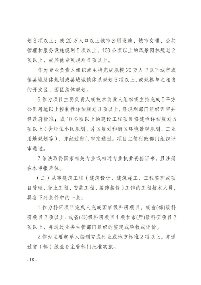 1.不具備上述學(xué)歷條件,取得高級工程(建筑)師任職資格后,從事本專(zhuān)業(yè)技術(shù)工作滿(mǎn)10年,可由2名本專(zhuān)業(yè)正高級工程(建筑)師推薦破格申報。