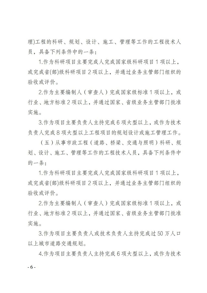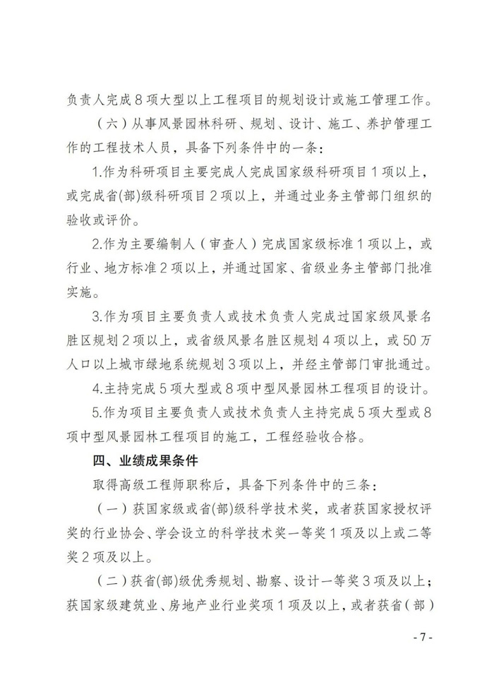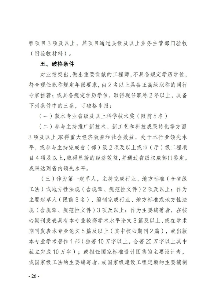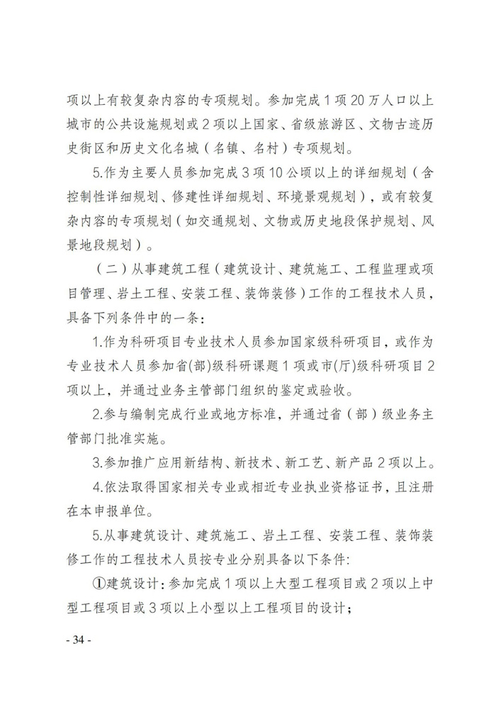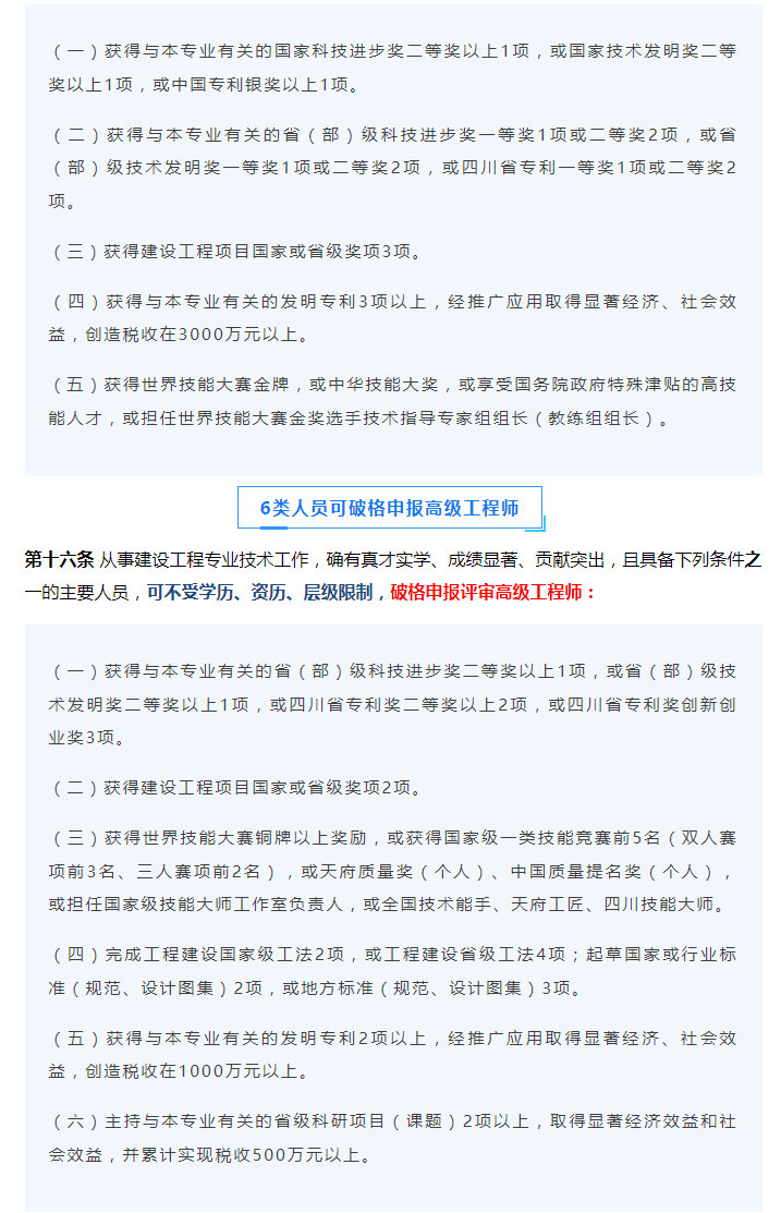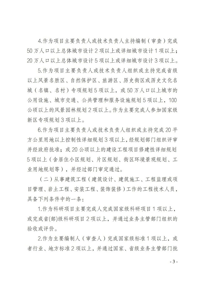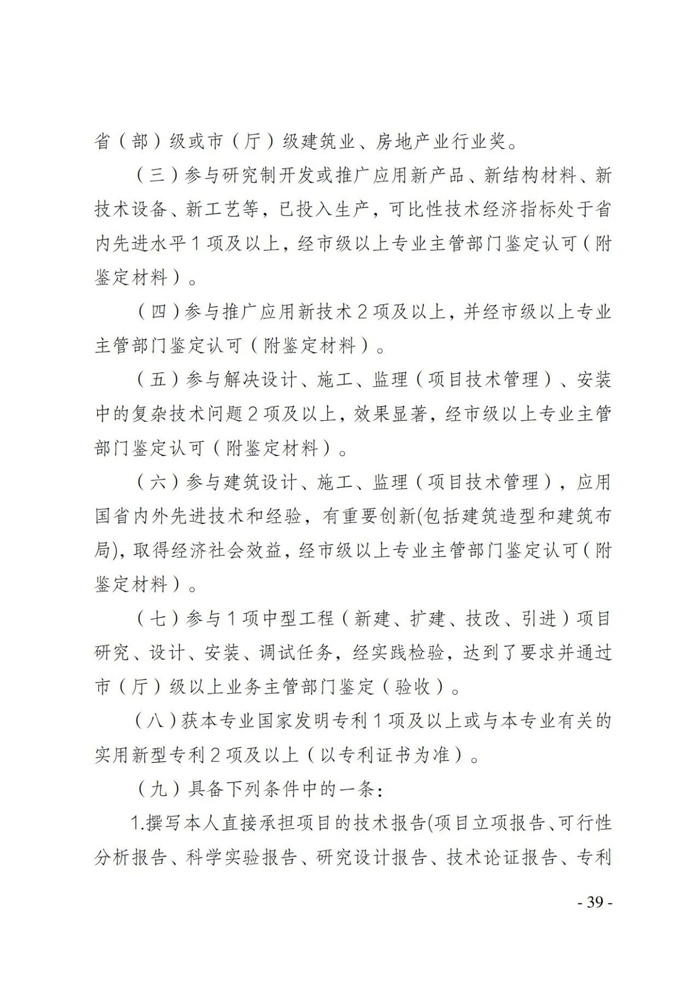 2.取得高級工程(建筑)師任職資格后,從事本專(zhuān)業(yè)技術(shù)工作滿(mǎn)3年。且在任現職期間,符合下列條件之一,可破格申報: