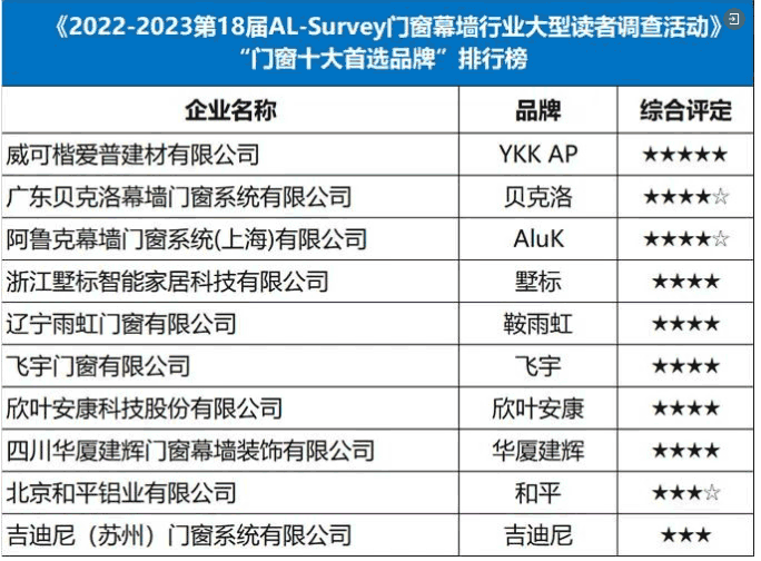 以上“TOP10”高端門(mén)窗品牌,由中國建筑金屬結構協(xié)會(huì )鋁門(mén)窗幕墻分會(huì )官方平臺——中國幕墻網(wǎng)ALwindoor.com根據“2022-2023年度AL-Survey門(mén)窗十大首選品牌榜單”為基礎,數據調研、整理分析之后發(fā)布。