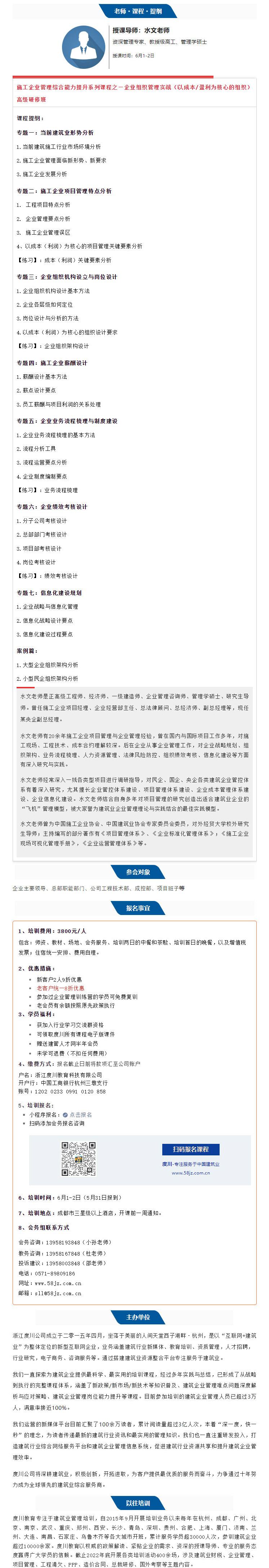度川教育始終關(guān)注建筑行業(yè)發(fā)展,致力于為建筑企業(yè)提供行之有效的方法和解決方案。針對以上問(wèn)題,我們特地組織相關(guān)專(zhuān)家研究,將于6月1-2日在成都舉辦《工程企業(yè)管理綜合能力提升系列課程之——企業(yè)組織管理實(shí)戰(以成本/盈利為核心的組織)高級研修班》。